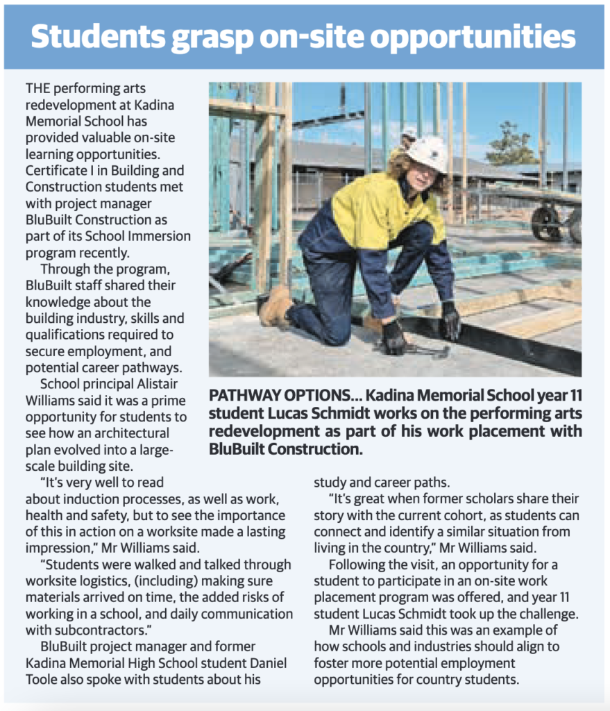 The Yorke Peninsula Country Times recently posted an article about the benefits of this program at the Kadina Memorial School Redevelopment project that BluBuilt are involved in with the Department for Infrastructure and Transport & Department for Education. The article has been posted below.